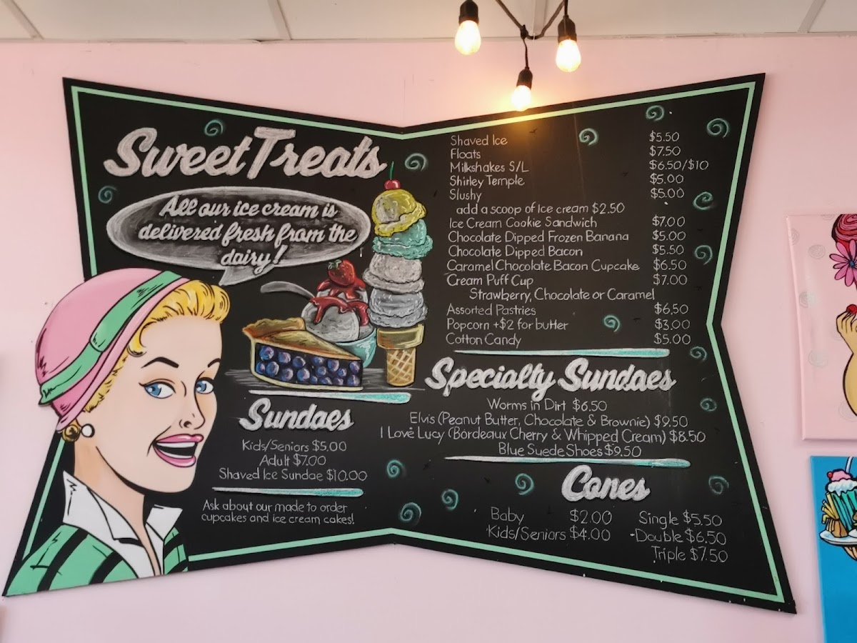 - Desserts: Homemade pies, freshly made cheesecake, jumbo cinnamon buns and muffins, banana splits, and assorted sundaes.