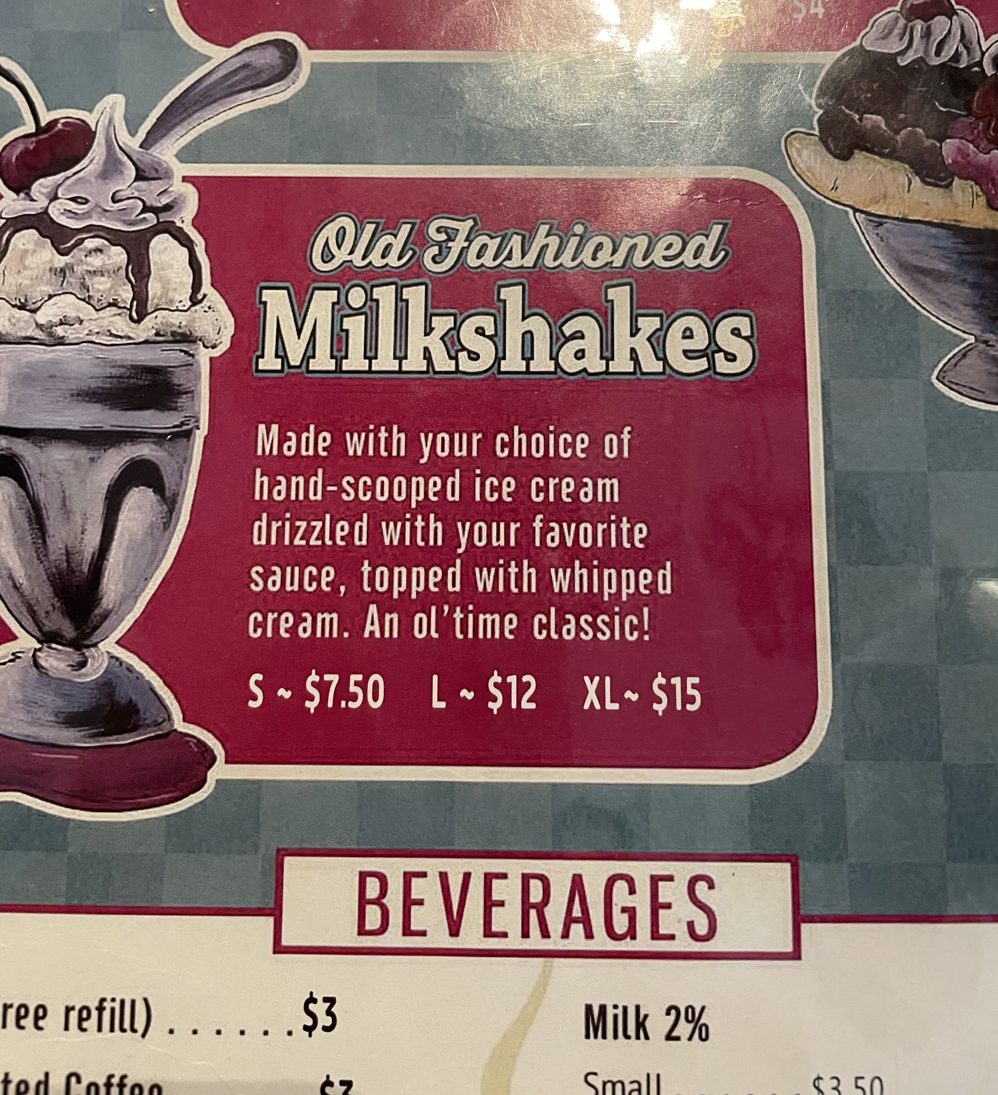 - Beverages: Milkshakes in various flavors including chocolate, strawberry, coffee almond fudge, and a selection of coffee and other drinks.